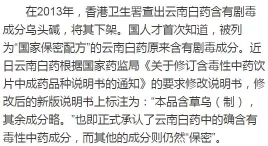 2月5日香港衛(wèi)生署、澳門衛(wèi)生局發(fā)文禁售五種云南白藥制劑,因?yàn)槔锩姹话l(fā)現(xiàn)含有未標(biāo)示的烏頭類生物堿。對許多云南白藥消費(fèi)者來說,這是他們首次聽說云南白藥中含有境外禁用的有毒中草藥烏頭。事實(shí)上,云南白藥的使用者幾乎都不知道其成分,因?yàn)樗趲资昵氨涣袨閲抑攸c(diǎn)保護(hù)的中藥制劑,其配方屬于國家機(jī)密,云南白藥也一直以“國家保密配方”作為營銷的噱頭。