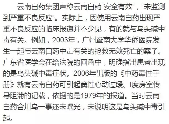 那么云南白藥究竟含不含烏頭呢?2003年,廣州暨南大學(xué)華僑醫(yī)院發(fā)生一起與云南白藥中毒有關(guān)的搶救無效死亡的案子。廣東省醫(yī)學(xué)會(huì)在給法院的回函中,依據(jù)中藥專家提出的意見和有關(guān)資料,認(rèn)為云南白藥含有草烏成分,患者出現(xiàn)的是烏頭堿中毒癥狀。這一證據(jù)被廣州市中級人民法院采納,寫入判決書中?,F(xiàn)在云南白藥廠已承認(rèn)云南白藥含有烏頭堿,但是辯解說他們的“獨(dú)特”處理方法能讓烏頭堿的毒性“大大降低”。當(dāng)然,這一空口無憑的辯解不會(huì)讓人信服,所以香港衛(wèi)生署、澳門衛(wèi)生局仍然把它禁售。