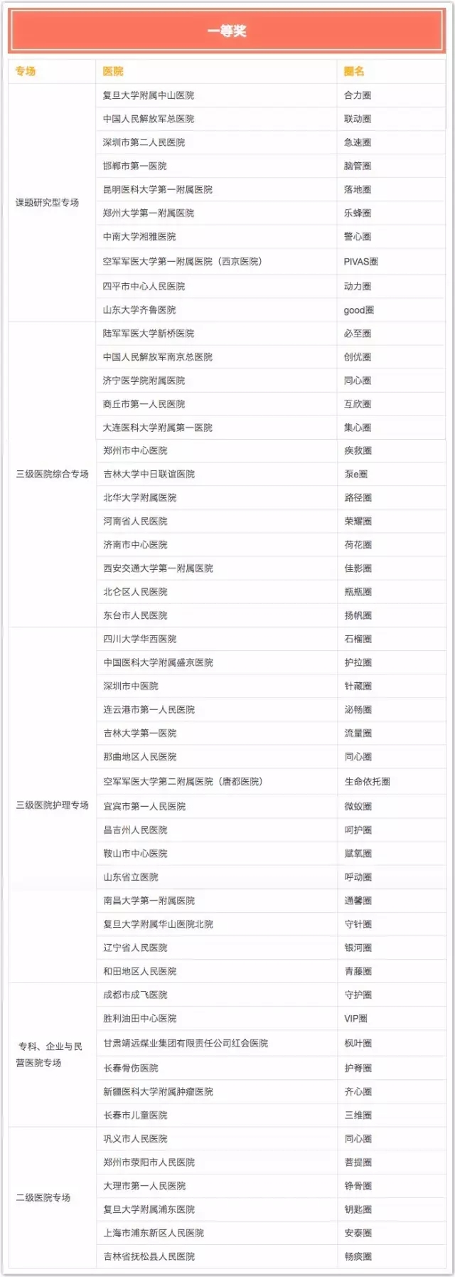 吉林大學(xué)第二醫(yī)院的“3D for U圈”榮獲特等獎;復(fù)旦大學(xué)附屬中山醫(yī)院、中國人民解放軍總醫(yī)院、鄭州大學(xué)第一附屬醫(yī)院等醫(yī)院獲課題研究型一等獎;河南省人民醫(yī)院、大連醫(yī)科大學(xué)附屬第一醫(yī)院、商丘市第一人民醫(yī)院等醫(yī)院獲得三級綜合場一等獎;深圳市中醫(yī)院、復(fù)旦大學(xué)附屬華山醫(yī)院北院、中國醫(yī)科大學(xué)附屬盛京醫(yī)院等醫(yī)院獲得三級護理一等獎……成都市成飛醫(yī)院、勝利油田中心醫(yī)院和長春市兒童醫(yī)院等醫(yī)院獲專科、企業(yè)與民營醫(yī)院專場一等獎。詳細名單附后。