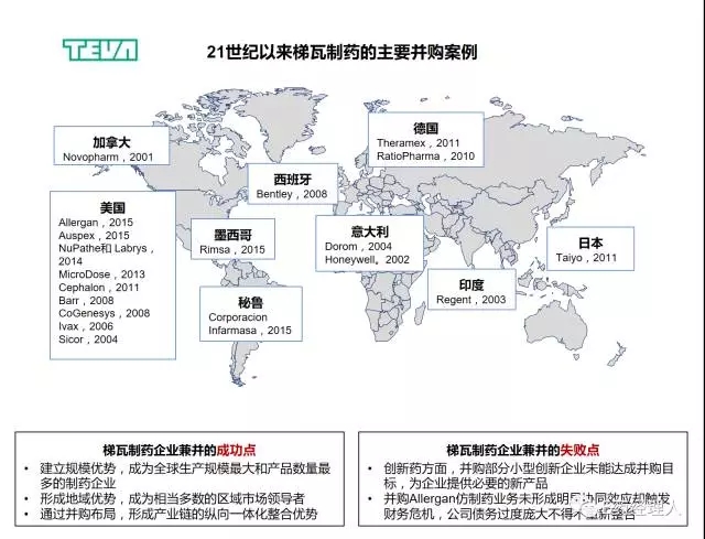 梯瓦制藥明顯就是一個(gè)最典型的例子。曾幾何時(shí),這個(gè)來(lái)自以色列的藥廠憑借著對(duì)市場(chǎng)的嗅覺(jué),利用內(nèi)生外延增長(zhǎng)并重的策略,在過(guò)去數(shù)十年里迅速?gòu)囊粋€(gè)偏隅中東的小企業(yè)成長(zhǎng)為業(yè)務(wù)遍及100多個(gè)國(guó)家的大型跨國(guó)公司,并成為全球仿制藥產(chǎn)業(yè)領(lǐng)頭企業(yè)直至今日。