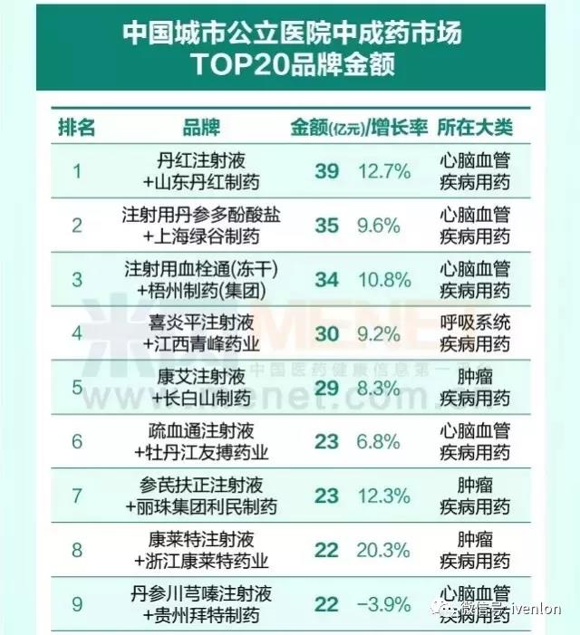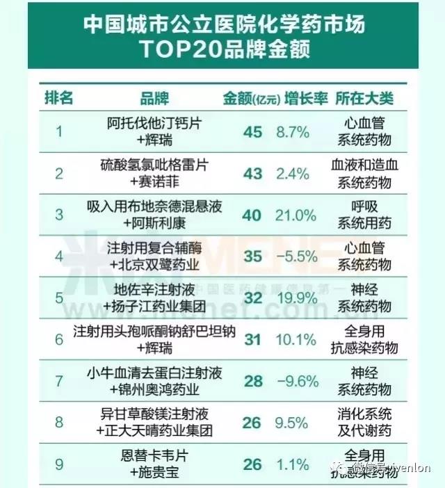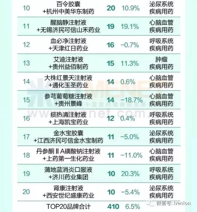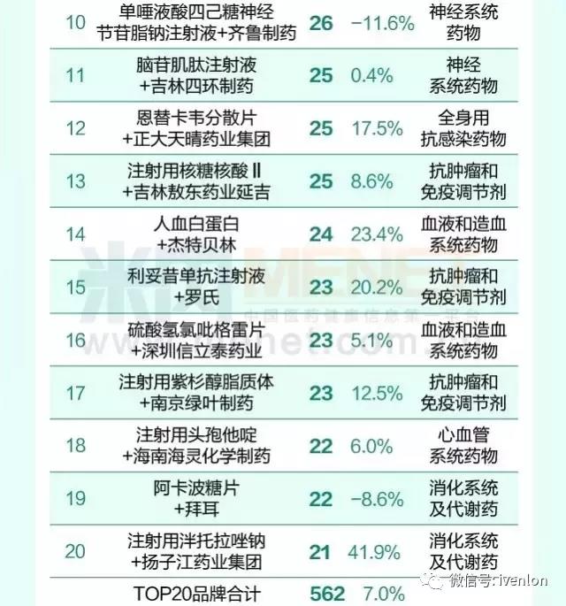 全國醫(yī)院市場(chǎng)銷售超10億的20個(gè)藥品