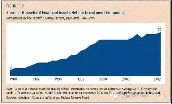 如果我們看美國(guó)的話,有一大批幾十年的基金管理公司,從Vanguard ,Templeton,到Fidelity,Capital等。毫無(wú)疑問(wèn)美國(guó)擁有一大批全球資產(chǎn)規(guī)模最大的基金公司。根據(jù)2013年底的數(shù)據(jù),美國(guó)資產(chǎn)管理公司規(guī)模14.7萬(wàn)億美元,其中13萬(wàn)億來(lái)自于共同基金。其中有一個(gè)重要的時(shí)代背景:過(guò)去30年美國(guó)經(jīng)濟(jì)的高速發(fā)展,大幅甩開(kāi)了日本,歐洲這些追趕者。這也導(dǎo)致美國(guó)企業(yè)受益于這30年的大發(fā)展,最終早就了一波大牛市。道瓊斯指數(shù)在1980年還只有1000點(diǎn),到了2000年突破了10000點(diǎn),20年上漲10倍。這也導(dǎo)致家庭資產(chǎn)在共同基金的配置也大幅提高。從1980年的3%提高到了今天的25%。