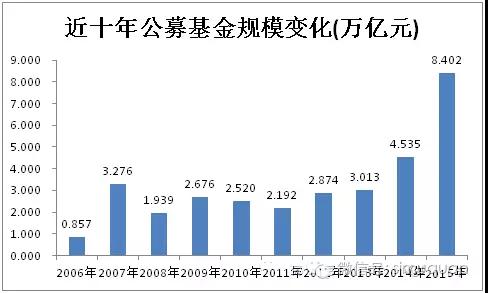 我們先說(shuō)說(shuō)公募基金。下圖是2006到2015年公募基金規(guī)模的變化??梢钥吹秸麄€(gè)公募基金的規(guī)模一定是在牛市最高點(diǎn)達(dá)到頂峰的。這也和商業(yè)模式有關(guān)。公募基金主要還是靠管理費(fèi)賺錢,規(guī)模越大收入越高。而且在牛市最癲狂的時(shí)候一定是基金最好發(fā)的,大量基金公司通過(guò)發(fā)行新產(chǎn)品完成了規(guī)模的跳躍。事實(shí)上,2007年牛市見(jiàn)頂后,如果僅僅看股票類資產(chǎn)規(guī)模的話,到了2014年還沒(méi)有真正回到07年的水平。在七年的“熊市”中,基金公司的資產(chǎn)規(guī)模主要通過(guò)貨幣,債券等產(chǎn)品做大。