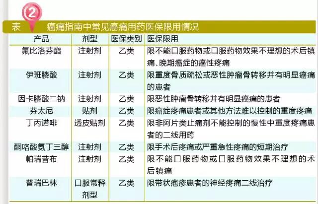 從2017年醫(yī)保目錄西藥部分可見(jiàn),癌痛指南中常見(jiàn)的癌痛用藥被限制使用的劑型主要是注射劑和貼劑,口服緩釋劑和緩控釋的限用較少。癌痛用藥最常用的是口服給藥,其次可選用貼劑或肛門栓。由于易耐藥、鎮(zhèn)痛時(shí)間短、副作用大等弊端,注射劑在癌痛治療中其實(shí)并不是主流提倡藥物,僅不宜口服者才考慮注射。