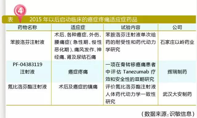 識(shí)敏信息發(fā)現(xiàn),2015年以后啟動(dòng)臨床的藥品中,適應(yīng)癥明確有癌癥疼痛的藥品有3個(gè)。其中輝瑞PF-04383119注射液是生物制品,治療的適應(yīng)癥與骨轉(zhuǎn)移癌相關(guān),預(yù)計(jì)主要用于治療骨痛。苯胺洛芬注射液2010年獲國(guó)家重大新藥創(chuàng)制專項(xiàng)立項(xiàng),2013年就已啟動(dòng)Ⅰ期臨床,2017年仍在臨床Ⅰ期階段。氟比洛芬酯注射液目前為原研獨(dú)家銷售,武漢大安的氟比洛芬酯注射液曾進(jìn)入第一次自查臨床核查目錄,主動(dòng)撤回后重新啟動(dòng)臨床,2017年9月重慶藥友獲批臨床,首仿究竟花落誰(shuí)家目前仍是未知數(shù)。