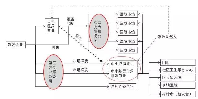 9.基層市場批發(fā)配送商業(yè):盤踞在縣城,以向縣級醫(yī)療機構(gòu)、鄉(xiāng)鎮(zhèn)醫(yī)院、藥店和村診所或村新農(nóng)合門診進行滲透為主的基層市場商業(yè)體系。