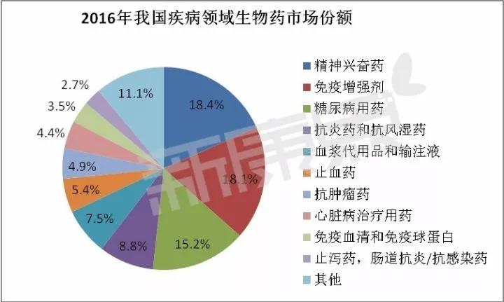 從疾病領(lǐng)域的市場(chǎng)份額來(lái)看,中康CMH的數(shù)據(jù)顯示,2016年top10的生物藥治療領(lǐng)域依次為:精神興奮藥(18.4%)、免疫增強(qiáng)劑(18.1%)、糖尿病用藥(15.2%)、抗炎藥和抗風(fēng)濕藥(8.8%)、血漿代用品和輸注液(7.5%)、止血藥(5.4%)、抗腫瘤藥(4.9%)、心臟病治療用藥(4.4%)、免疫血清和免疫球蛋白(3.5%)、止瀉藥,腸道抗炎/抗感染藥(2.7%)。