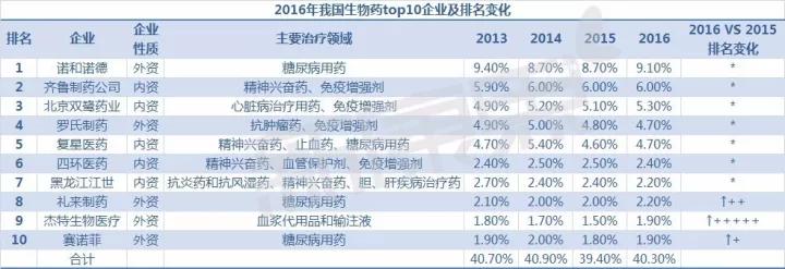 中康CMH的數(shù)據(jù)顯示,2016年我國(guó)生物藥top10企業(yè)合計(jì)占40.3%的市場(chǎng)份額,內(nèi)資和外資企業(yè)各占5席,其中外企諾和諾德連續(xù)四年名列生物藥市場(chǎng)榜首,據(jù)了解,諾和諾德在中國(guó)的產(chǎn)品主要是降糖藥胰島素和止血藥重組人凝血因子VIIa。進(jìn)入top10的5家國(guó)內(nèi)企業(yè)分別是齊魯制藥、北京雙鷺?biāo)帢I(yè)、復(fù)星醫(yī)藥、四環(huán)醫(yī)藥、黑龍江江世。其中, top7的排名在2013-2015年的排名均沒(méi)有發(fā)生變化;排名上升的均是外資企業(yè),其中杰特生物醫(yī)療的上升速度最快,上升了五名,該企業(yè)只有血漿代用品和輸注液的人血白蛋白產(chǎn)品;另外兩家企業(yè)是禮來(lái)制藥和賽諾菲,分別上升了兩名、一名;禮來(lái)制藥在中國(guó)的生物藥主要是用于治療糖尿病的胰島素和骨病治療的特立帕肽;賽諾菲在中國(guó)的生物藥主要是用于治療糖尿病的胰島素和抗病毒、抗細(xì)菌的疫苗類。