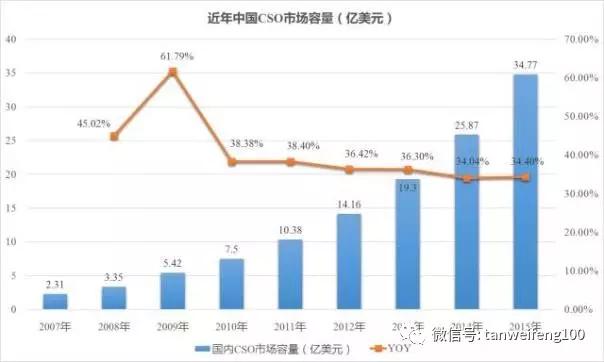 由于國內(nèi)藥品銷售制度處于規(guī)范過程中,加之藥企控制成本的需要,CSO在國內(nèi)尚處于引入期。但隨著我國藥品銷售市場規(guī)范進(jìn)程和進(jìn)口藥銷售需求的增長,國內(nèi)CSO市場也在迅猛增長中。據(jù)Frost&Sullivan的統(tǒng)計,2007年國內(nèi)藥品營銷、推廣、銷售服務(wù)行業(yè)市場規(guī)模為2.31億美元,2015年增長至34.77億美元。