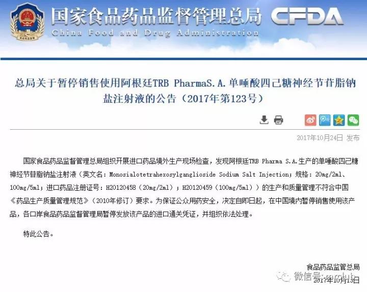 總局關(guān)于暫停銷售使用阿根廷TRB PharmaS.A.單唾酸四己糖神經(jīng)節(jié)苷脂鈉鹽注射液的公告(2017年第123號(hào))