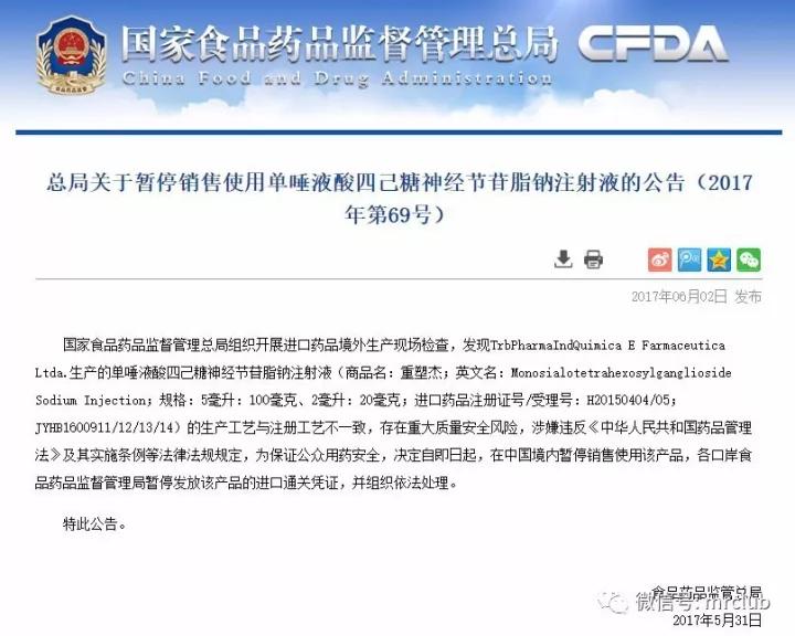 總局關(guān)于暫停銷售使用單唾液酸四己糖神經(jīng)節(jié)苷脂鈉注射液的公告(2017年第69號(hào))