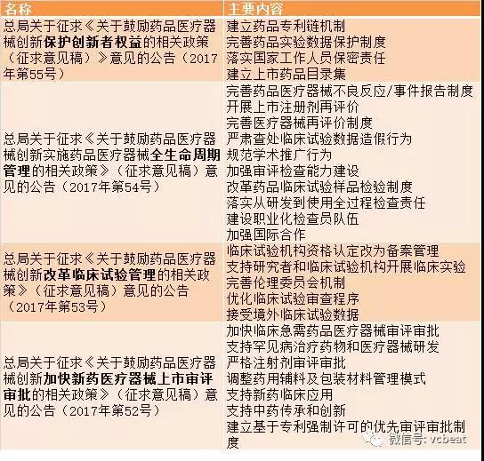 首先來看藥物及醫(yī)療器械研發(fā)方面的政策,最先提及的是CFDA5月11日連發(fā)的四項(xiàng)關(guān)于鼓勵(lì)藥品醫(yī)療器械創(chuàng)新的相關(guān)政策。