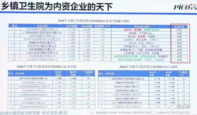 基層公立醫(yī)療機(jī)構(gòu)的另一個重要(藥品使用)終端——鄉(xiāng)鎮(zhèn)衛(wèi)生院,則是內(nèi)資企業(yè)的天下。從上圖可以看出,2016年鄉(xiāng)鎮(zhèn)衛(wèi)生院用藥市場(包括化藥和中成藥),排名前10位的企業(yè)均為內(nèi)資企業(yè),共占據(jù)這一市場總體份額的13.67%。