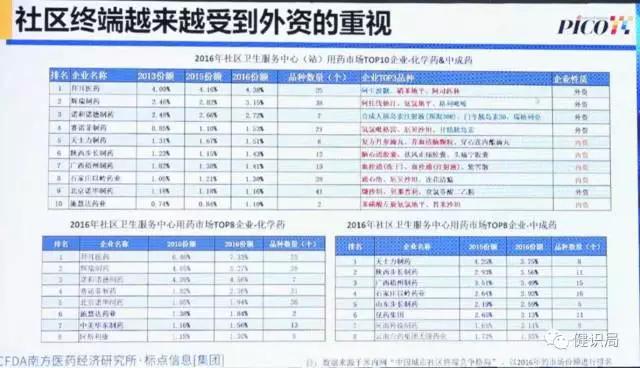 2016年,上述5家外資藥企占據(jù)城市社區(qū)醫(yī)療用藥終端12.94%的市場份額,比2015年增長1.02%。