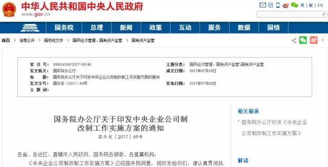 務(wù)院辦公廳日前印發(fā)《中央企業(yè)公司制改制工作實施方案》