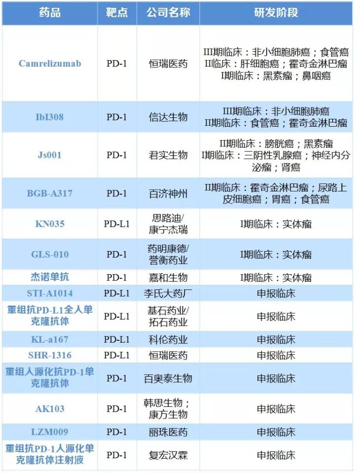 表6 國內(nèi)企業(yè)申報的PD1/PD-L1藥物及研發(fā)階段
