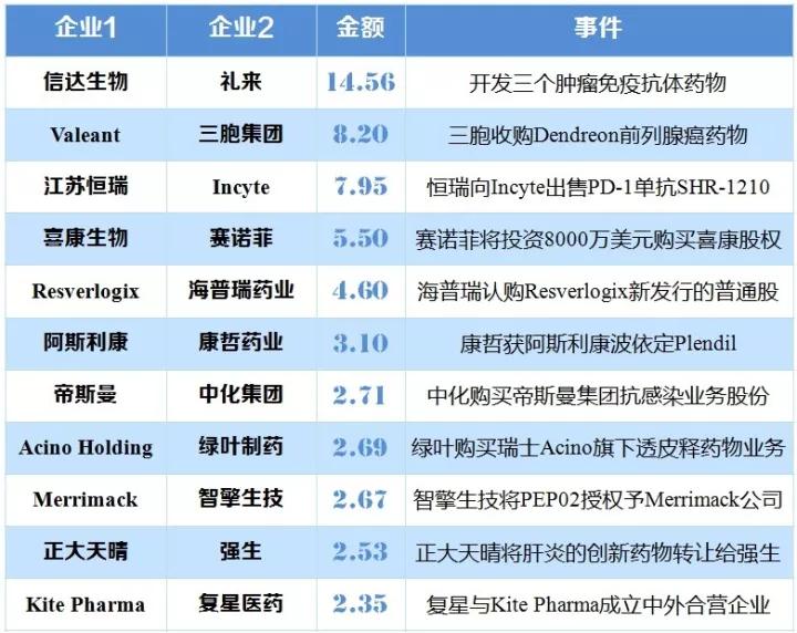 表4 中國藥企與國外藥企重磅交易TOP 10(億美元)