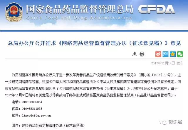 今天(11月14日),國(guó)家食品藥品監(jiān)管總局(簡(jiǎn)稱(chēng)CFDA)發(fā)布《網(wǎng)絡(luò)藥品經(jīng)營(yíng)監(jiān)督管理辦法(征求意見(jiàn)稿)》,再次強(qiáng)調(diào)按照“線上線下一致”原則,落實(shí)監(jiān)管部門(mén)責(zé)任,規(guī)范互聯(lián)網(wǎng)藥品、醫(yī)療器械交易行為。