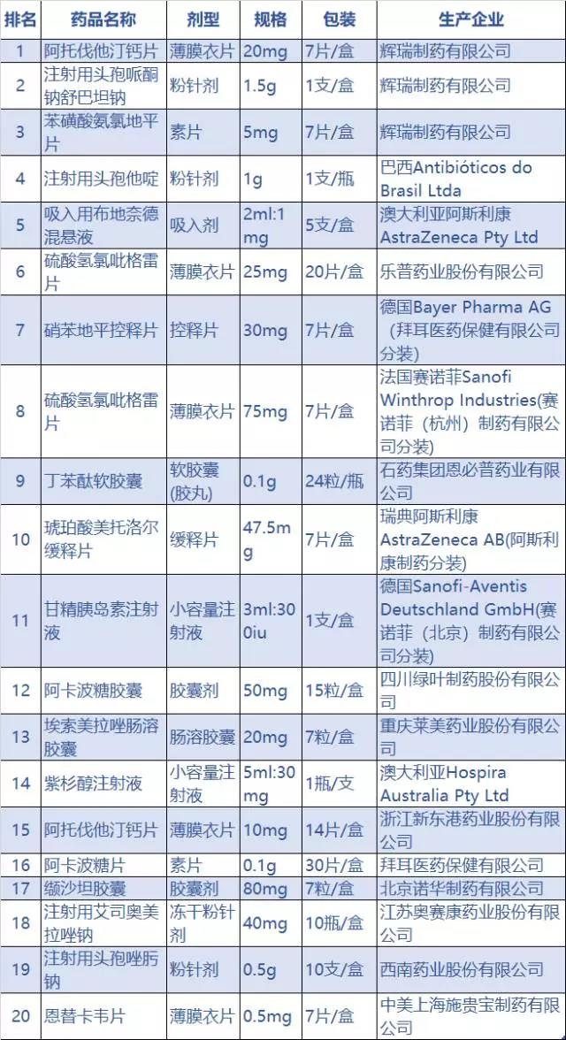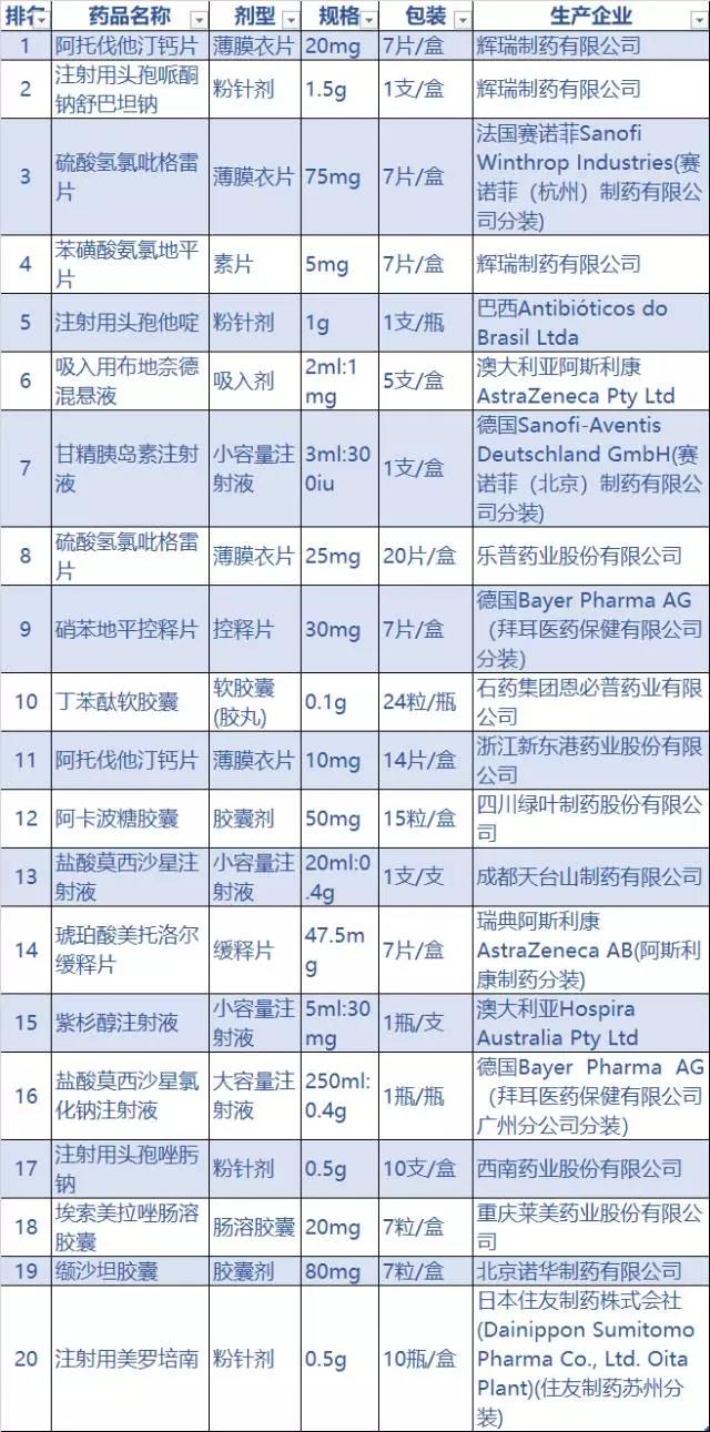 福建省藥品聯(lián)合限價陽光采購藥品入庫金額排名前20(9月)