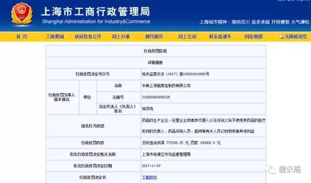 上海市楊浦區(qū)市場監(jiān)督管理局對施貴寶的上述違法行為作出行政處罰:沒收違法所得772536.25元;罰款100000.0元。