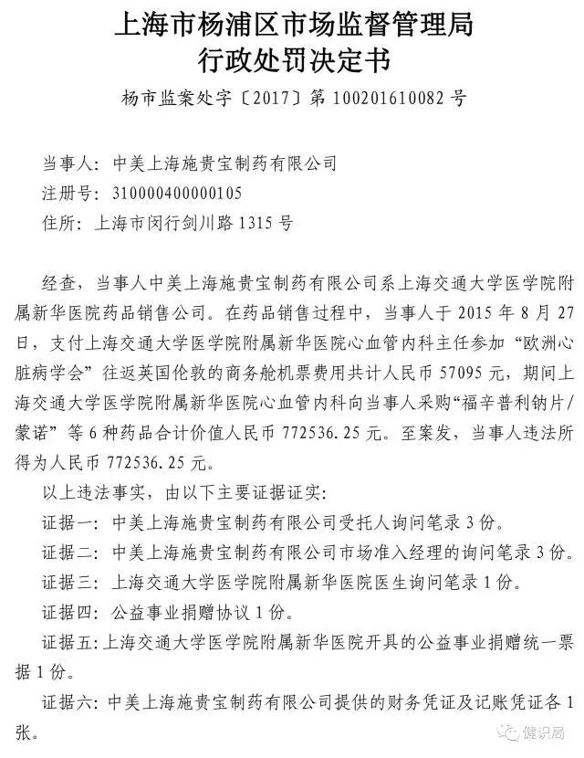 日前,上海工商管理局官網公布一則行政處罰信息:中美上海施貴寶制藥有限公司(簡稱“施貴寶”)在藥品銷售過程中,于 2015 年 8 月 27日,支付上海交通大學醫(yī)學院附屬新華醫(yī)院心血管內科主任參加“歐洲心臟病學會”往返英國倫敦的商務艙機票費用共計人民幣 57095 元,期間上海交通大學醫(yī)學院附屬新華醫(yī)院心血管內科向當事人采購“福辛普利鈉片/蒙諾”等 6 種藥品合計價值人民幣 772536.25 元。