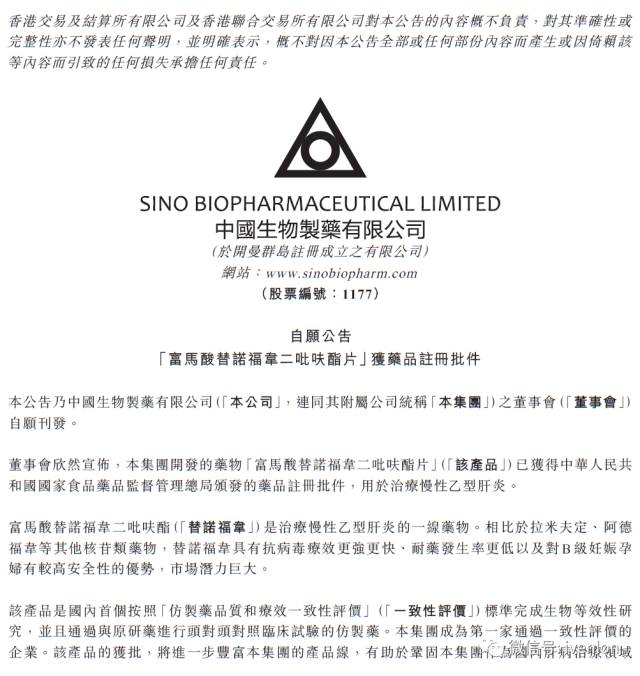 “董事會(huì)欣然宣布,本集團(tuán)開發(fā)的藥物「富馬酸替諾福韋二吡呋酯片」(「該產(chǎn)品」)已獲得中華人民共 和國(guó)國(guó)家食品藥品監(jiān)督管理總局頒發(fā)的藥品注冊(cè)批件,用於治療慢性乙型肝炎。