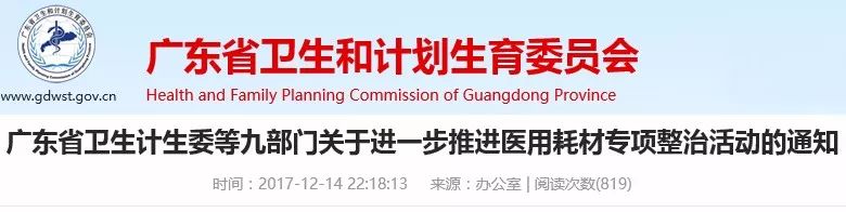 12月14日,廣東衛(wèi)計(jì)委、發(fā)改委等9部門聯(lián)合發(fā)布《關(guān)于進(jìn)一步推進(jìn)醫(yī)用耗材專項(xiàng)整治活動(dòng)的通知》(下稱通知)。