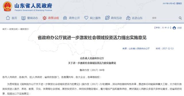 近日,山東省人民政府辦公廳公布《關(guān)于進一步激發(fā)社會領(lǐng)域投資活力的實施意見》(下稱《意見》)?!兑庖姟诽岢?,凡法律法規(guī)未明令禁入的社會投資領(lǐng)域,都要向社會力量全面開放,鼓勵新增服務(wù)和產(chǎn)品由社會力量提供。