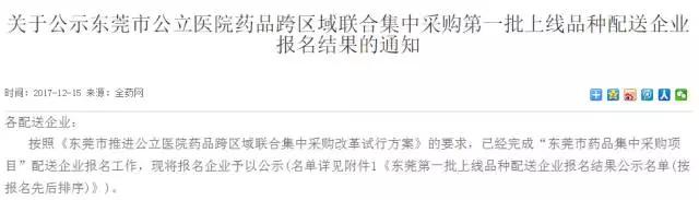 今日(12月15日),全藥網(wǎng)公示東莞市公立醫(yī)院藥品跨區(qū)域聯(lián)合采購第一批上線品種配送企業(yè),公示時間為2017年12月15日11:30至2017年12月17日17:30。