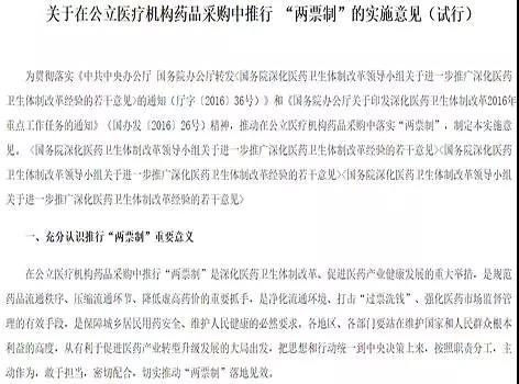 國(guó)家層面正式提出“兩票制”,是2016年4月,國(guó)務(wù)院常務(wù)會(huì)審議《深化醫(yī)藥衛(wèi)生體制改革2016年重點(diǎn)工作任務(wù)》,提出在綜合醫(yī)改試點(diǎn)省份和公立醫(yī)院綜合改革試點(diǎn)城市推行“兩票制”。