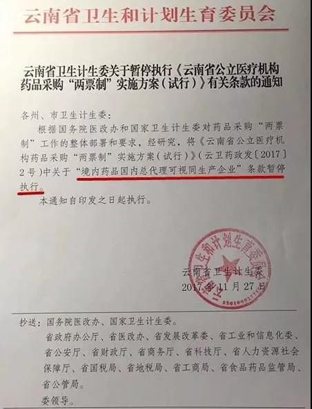 11月,云南對(duì)“兩票制”實(shí)施方案做出類似調(diào)整, 暫停對(duì)“境內(nèi)藥品國(guó)內(nèi)總代視為生產(chǎn)企業(yè)”。