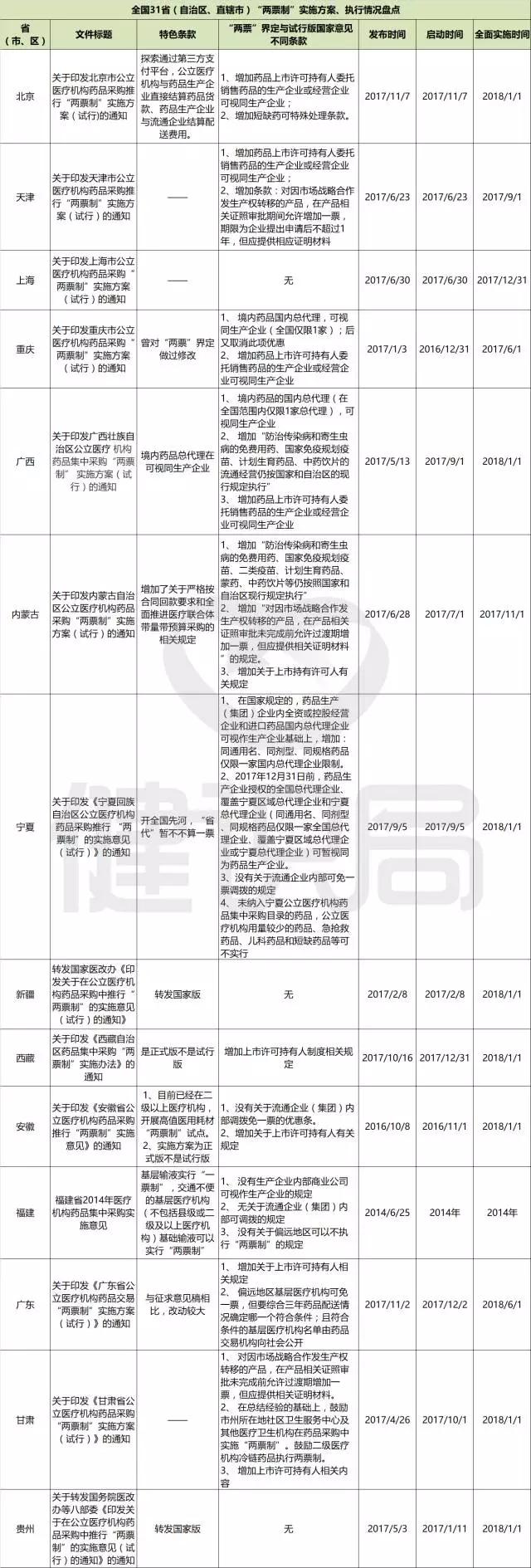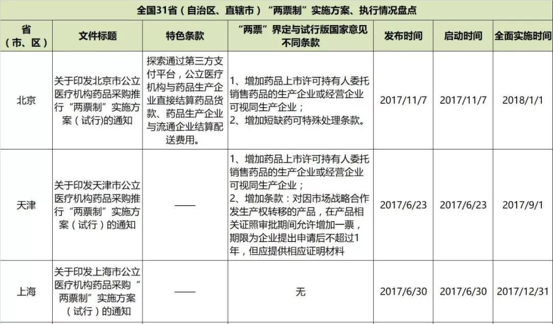 健識(shí)君梳理,自2016年10月安徽省執(zhí)行“兩票制”以來(lái),除港澳臺(tái)地區(qū)外,全國(guó)31省、直轄市、自治區(qū)均已發(fā)布“兩票制”實(shí)施方案或轉(zhuǎn)發(fā)國(guó)家版實(shí)施意見,明確執(zhí)行“兩票制”時(shí)間表。國(guó)家醫(yī)改辦體改司統(tǒng)計(jì),目前,全國(guó)已有至少2/3的城市在公立醫(yī)院藥品采購(gòu)中,執(zhí)行“兩票制”。
