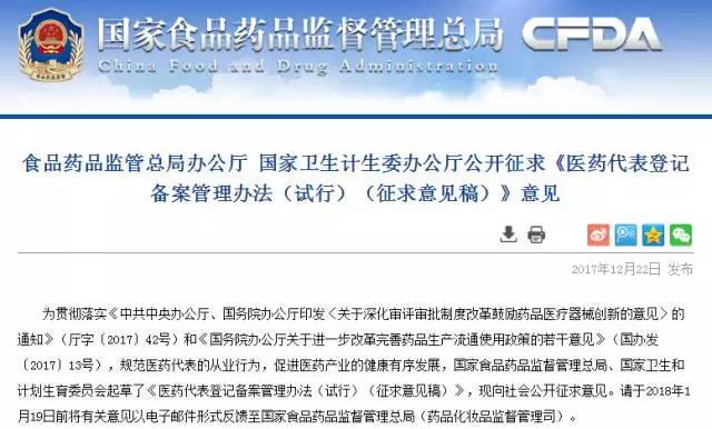 12月22日,國家食品藥品監(jiān)督管理總局、國家衛(wèi)生和計劃生育委員會聯(lián)合發(fā)布《醫(yī)藥代表登記備案管理辦法(試行)(征求意見稿)》,規(guī)定醫(yī)藥代表須由藥品上市許可持有人負(fù)責(zé)平臺備案,并且只能通過以下五種形式與醫(yī)務(wù)人員進(jìn)行溝通