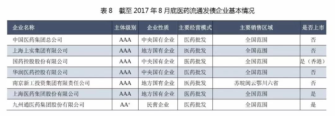 截至2017年8月底,在中國境內(nèi)債券市場公開發(fā)行債券的醫(yī)藥流通企業(yè)主要為4家全國性龍頭企業(yè)及其子公司,以及部分區(qū)域性龍頭企業(yè)。所發(fā)行債券處于存續(xù)期內(nèi)的發(fā)行主體合計14家,其中醫(yī)藥批發(fā)企業(yè)12家。