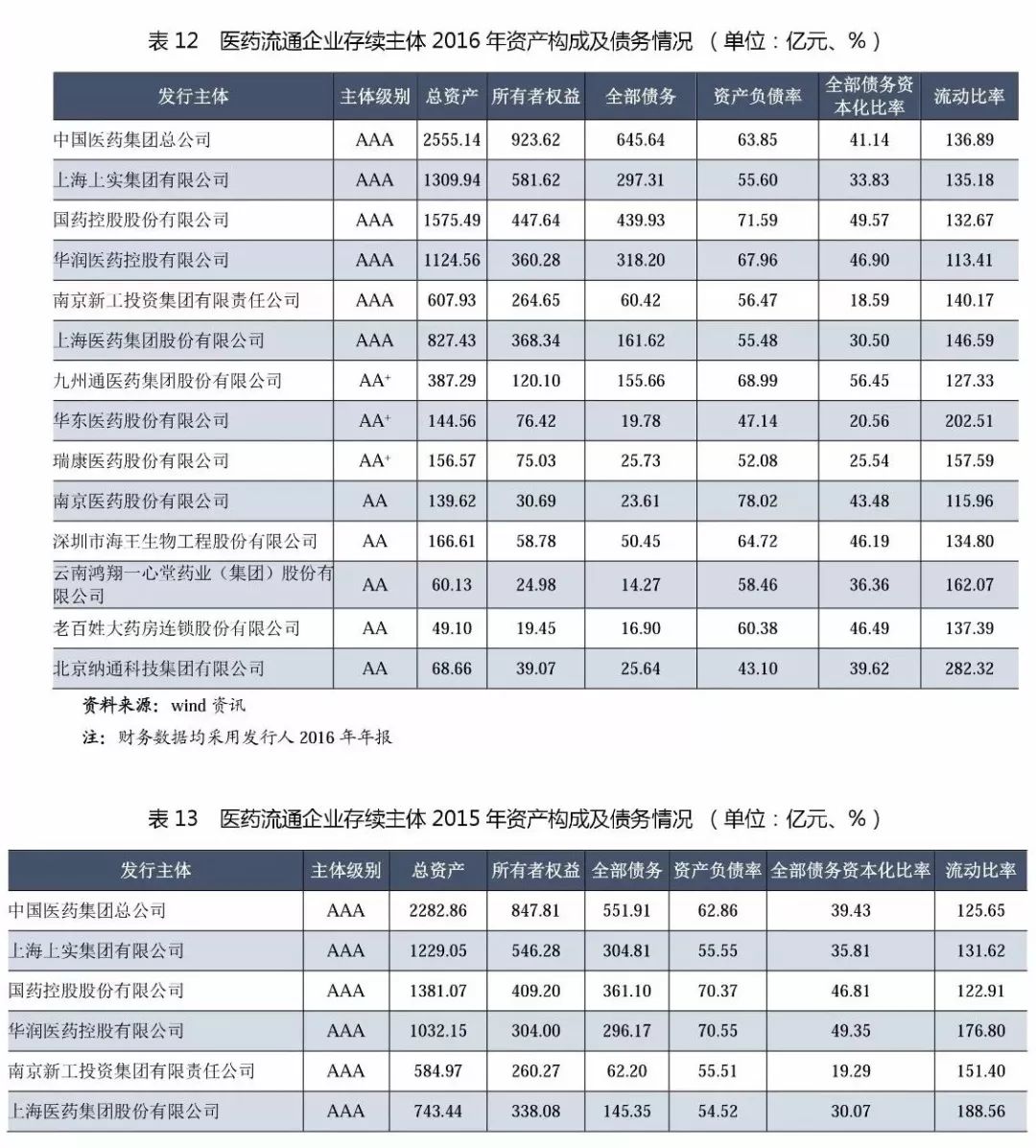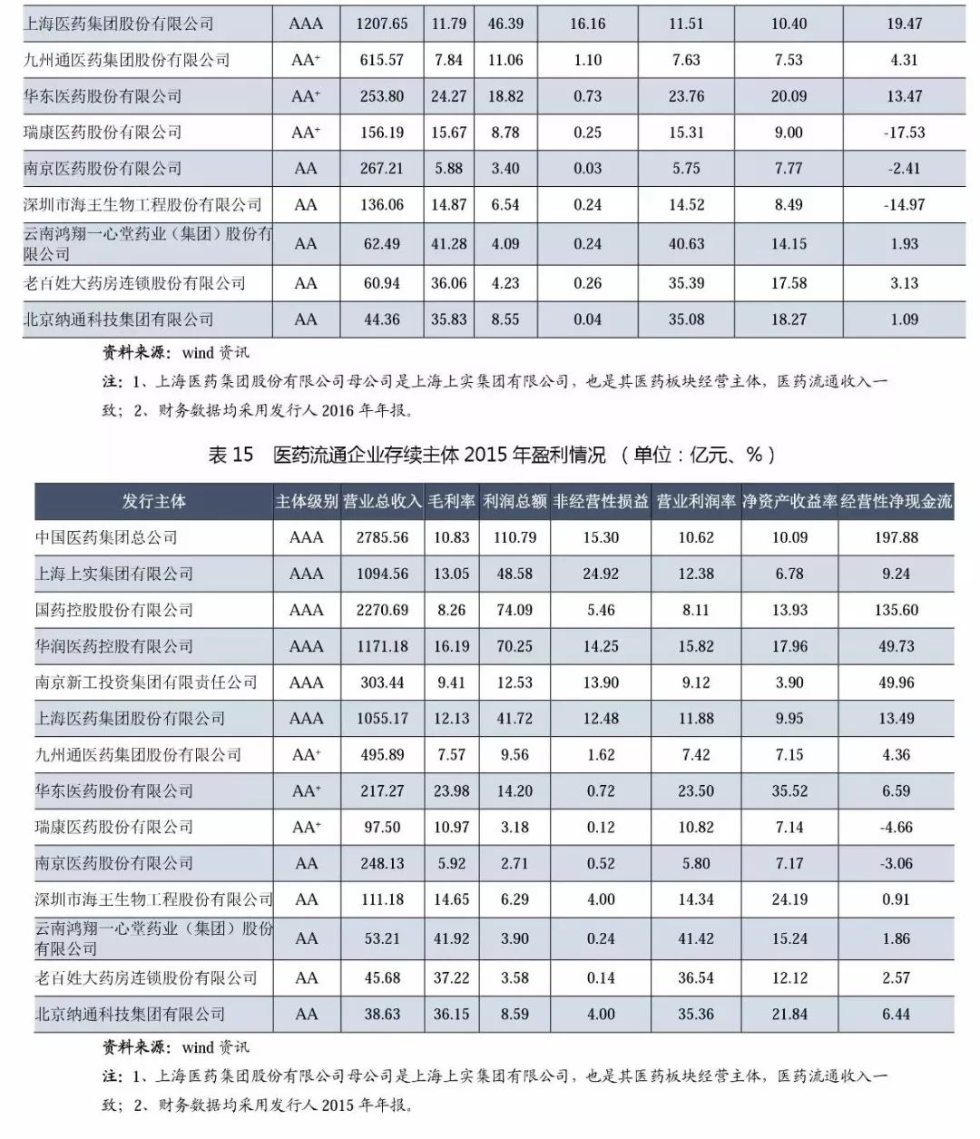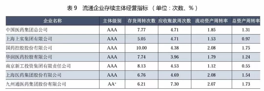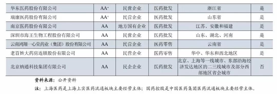 (1)從級別分布來看,主體長期信用等級為AAA的企業(yè)有6家,其中中國醫(yī)藥集團、華潤醫(yī)藥控股和上海醫(yī)藥(上海上實的醫(yī)藥流通經(jīng)營主體)為3家全國性的醫(yī)藥流通企業(yè),上述企業(yè)均為中央企業(yè)和國有企業(yè),擁有廣闊的分銷渠道和上下游資源,銷售終端為醫(yī)院,經(jīng)過多年的兼并、收購成長為全國性醫(yī)藥流通巨頭。南京新工是地方國企,已發(fā)展成為區(qū)域性流通龍頭;國藥控股是中國醫(yī)藥集團總公司旗下醫(yī)藥流通板塊主要運營主體,目前已建立了中國最大的、直達終端的藥品分銷、零售連鎖和物流配送網(wǎng)絡(luò)。
