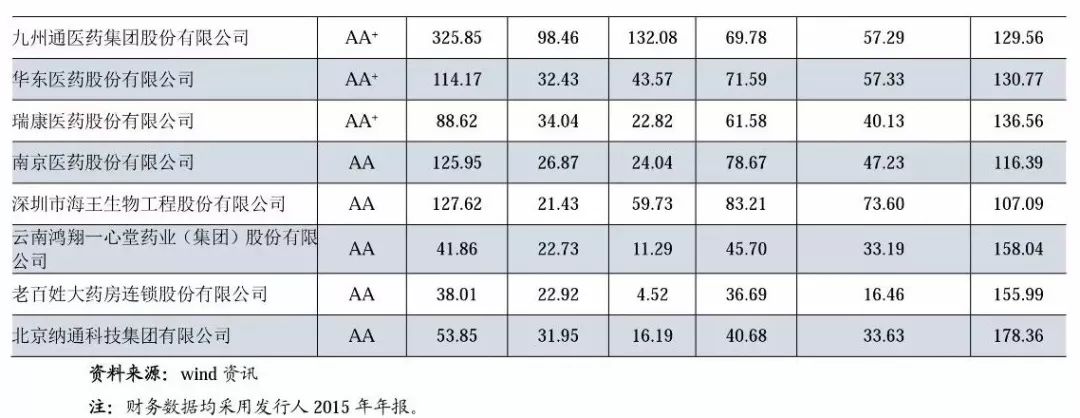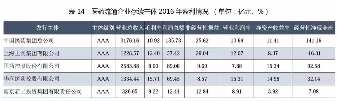 (4)從企業(yè)性質(zhì)來看,發(fā)行人中國有企業(yè)和民營企業(yè)在資產(chǎn)規(guī)模、營業(yè)收入規(guī)模和利潤總額等指標上有明顯差距,由于歷史原因使得國有企業(yè)擁有廣闊的分銷渠道、上下游資源和品牌價值。此外,藥品作為關(guān)系消費者健康的特殊商品,在政策上受到嚴格管控,上述因素使得行業(yè)壁壘較高,普通企業(yè)難以進入。從債務(wù)負擔來看,國有企業(yè)和民營企業(yè)的資產(chǎn)負債率均在60%上下,全部債務(wù)資本化比率在40%左右,符合行業(yè)特性。2016年,兩種類型企業(yè)的債務(wù)負擔產(chǎn)生分化,國有企業(yè)資產(chǎn)負債率及全部債務(wù)資本化比率中位數(shù)分別為63.85%和41.14%,分別同比上升0.99個百分點和上升1.71個百分點,而民營企業(yè)2016年上述兩項指標中位數(shù)分別同比下降3.12個百分點和下降0.51個百分點,主要系2016年民營企業(yè)凈利潤累積較快以及部分民營企業(yè)實施定增使得所有者權(quán)益大幅增長。從盈利能力和經(jīng)營效率來看,民營企業(yè)顯著優(yōu)于國有企業(yè),主要系國有企業(yè)自身體量過于龐大,各項費用支出對利潤侵蝕影響大,經(jīng)營效率普遍較低,而民營企業(yè)正好相反。從財務(wù)指標的變動率來看,由于民營企業(yè)各項財務(wù)指標絕對值較小,因此增長普遍較快,隨著新醫(yī)改政策的逐步落實,資本市場融資渠道的拓寬,未來民營醫(yī)藥流通企業(yè)仍將保持較高的增長速度。從融資渠道來看,14家發(fā)行人中,有9家為上市公司,剩余5家中中國醫(yī)藥集團、上海上實分別為國藥控股和上海醫(yī)藥的控股股東;華潤醫(yī)藥控股的控股股東華潤醫(yī)藥集團有限公司為香港上市公司;南京新工為南京醫(yī)藥的控股股東,發(fā)行人融資渠道暢通。
