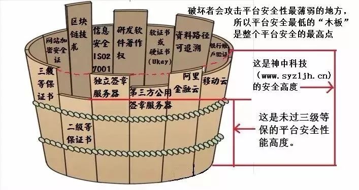 網(wǎng)站的加密、用戶身份的認(rèn)證、獨(dú)立的簽章服務(wù)器(第三方的簽章服務(wù)器是各行各業(yè)、個人和企業(yè)公用的,類似于自家?guī)凸矌膮^(qū)別)、存儲的云服務(wù)、三級等保、著作權(quán)、研發(fā)迭代、信息安全認(rèn)證ISO27001,可追溯的業(yè)務(wù)邏輯、銀行賬戶驗(yàn)證等一些列的安全措施。一般破壞者選擇安全性最薄弱的環(huán)節(jié)攻擊破壞平臺,所以平臺安全性最低的“木板”就是整個平臺最高的安全性能。