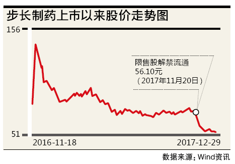 2017年11月20日是步長制藥上市滿一年的日子,在這一天,占公司總股本37.85%的2.58億股限售股解禁流通,公司股價迅速下挫,從10月份的75元左右跌至12月28日的50元附近。一連串的暴跌一度引發(fā)了質(zhì)押股票平倉風(fēng)險,致使控股股東不得不在12月5日補(bǔ)充質(zhì)押500萬股。