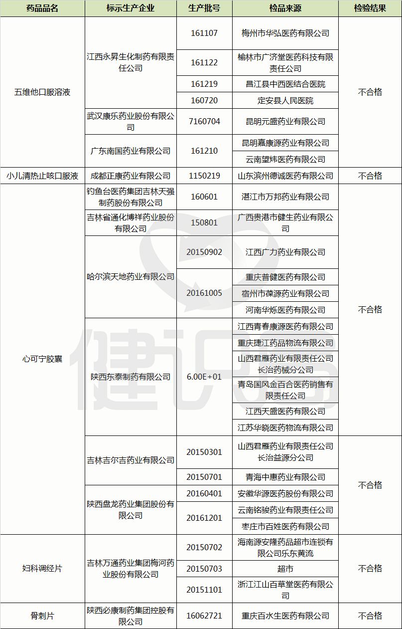 不合格產(chǎn)品的標示生產(chǎn)企業(yè)、藥品品名和生產(chǎn)批號為:江西永昇生化制藥有限責任公司生產(chǎn)的批號為160720、161107、161122、161219的五維他口服溶液,武漢康樂藥業(yè)股份有限公司生產(chǎn)的批號為07160704的五維他口服溶液,廣東南國藥業(yè)有限公司生產(chǎn)的批號為161210的五維他口服溶液;成都正康藥業(yè)有限公司生產(chǎn)的批號為01150219的小兒清熱止咳口服液;釣魚臺醫(yī)藥集團吉林天強制藥股份有限公司生產(chǎn)的批號為160601的心可寧膠囊,吉林省通化博祥藥業(yè)股份有限公司生產(chǎn)的批號為150801的心可寧膠囊,吉林吉爾吉藥業(yè)有限公司生產(chǎn)的批號為20150301、20150701的心可寧膠囊,哈爾濱天地藥業(yè)有限公司生產(chǎn)的批號為20150902、20161005的心可寧膠囊,陜西東泰制藥有限公司生產(chǎn)的批號為6E01的心可寧膠囊,陜西盤龍藥業(yè)集團股份有限公司生產(chǎn)的批號為20160401、20161201的心可寧膠囊;吉林萬通藥業(yè)集團梅河藥業(yè)股份有限公司生產(chǎn)的批號為20150702、20150703、20151101的婦科調(diào)經(jīng)片;陜西必康制藥集團控股有限公司生產(chǎn)的批號為16062721的骨刺片。不合格項目包括裝量、含量測定、水分、微生物限度等