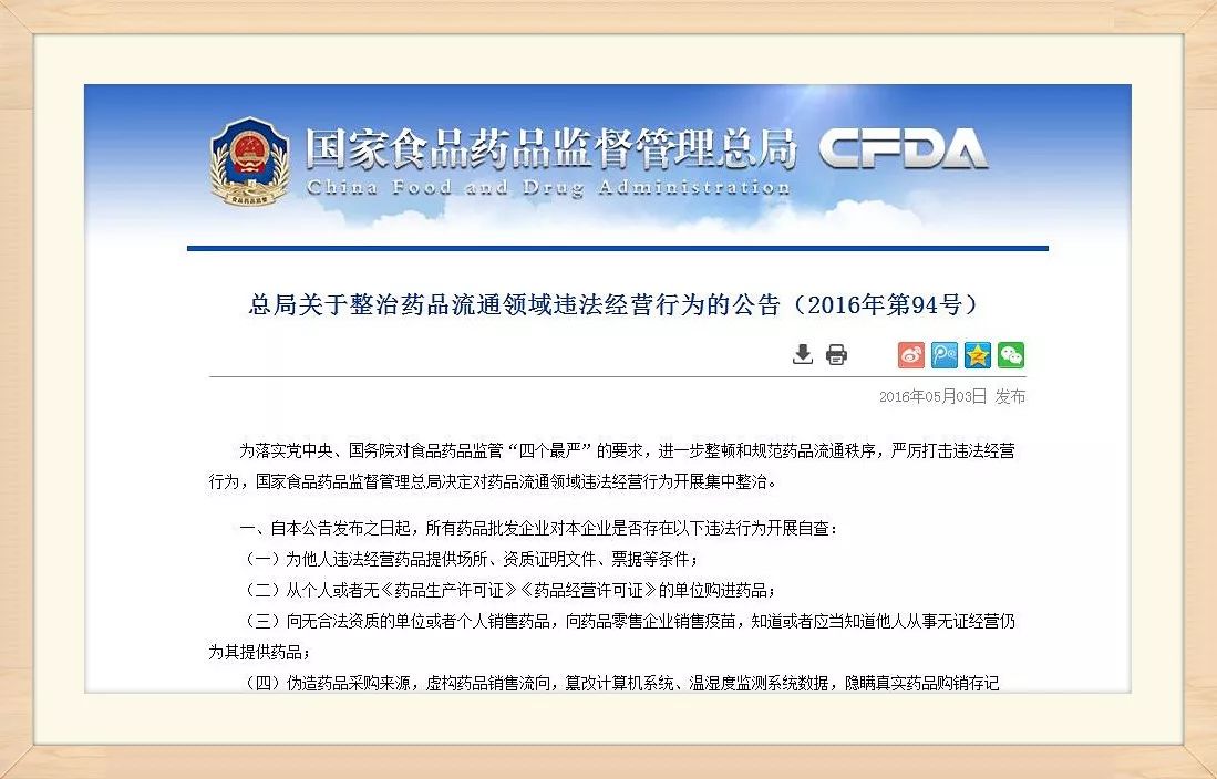 為落實(shí)黨中央、國(guó)務(wù)院對(duì)食品藥品監(jiān)管“四個(gè)最嚴(yán)”的要求,進(jìn)一步整頓和規(guī)范藥品流通秩序,嚴(yán)厲打擊違法經(jīng)營(yíng)行為,2016年4月29日,國(guó)家食品藥品監(jiān)督管理總局發(fā)布《關(guān)于整治藥品流通領(lǐng)域違法經(jīng)營(yíng)行為的公告》(2016年第94號(hào)),對(duì)藥品流通領(lǐng)域違法經(jīng)營(yíng)行為開(kāi)展集中整治。