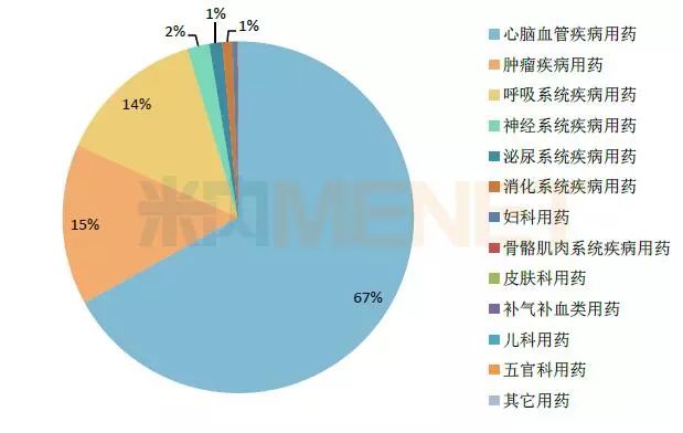 在中成藥市場的13個大類中,涉及注射劑的有9個,其中,心腦血管疾病用藥的占比超過六成,銷售額超過701億元,腫瘤疾病用藥以及呼吸系統(tǒng)疾病用藥兩個大類緊跟其后,銷售額均超過100億元。