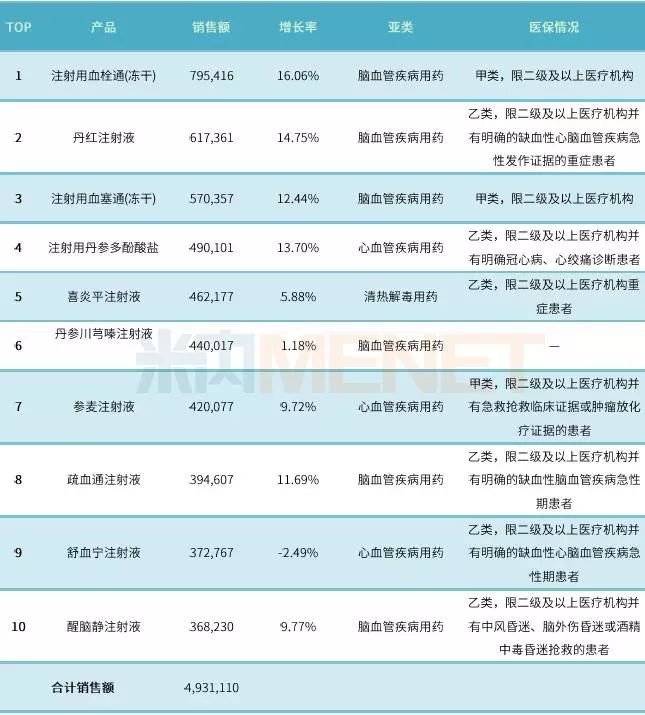 TOP10產(chǎn)品合計(jì)銷售額超過493億元,銷售額超過40億元的產(chǎn)品有7個,除了丹參川芎嗪注射液外,其余9個均進(jìn)入了新版國家醫(yī)保目錄。