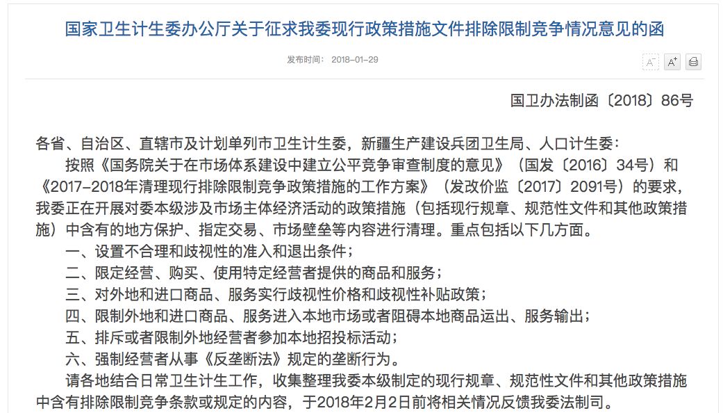國家衛(wèi)計(jì)委近日發(fā)出關(guān)于征求對(duì)本委現(xiàn)行政策措施文件排除限制競(jìng)爭(zhēng)情況意見的函,這是國家衛(wèi)計(jì)委在本系統(tǒng)落實(shí)國務(wù)院(2016)36號(hào)文和發(fā)改委〔2017〕1849號(hào)文、〔2017〕2091號(hào)文的具體措施。筆者以為,衛(wèi)計(jì)系統(tǒng)排除、限制競(jìng)爭(zhēng)情況最為明顯之處,就在于藥品的集中采購。