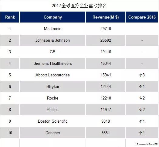 BD醫(yī)療因美國、歐洲地區(qū)銷量疲軟,2017年業(yè)績下滑,同比-6%,加上還未并入巴德公司財報,掉出醫(yī)療巨頭前10,以5億美元的差距排在丹納赫之后。