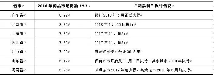 就目前來(lái)看,“兩票制”已進(jìn)入實(shí)施階段的省份,大多藥品市場(chǎng)容量不大。從商務(wù)部2016年的統(tǒng)計(jì)數(shù)據(jù)來(lái)看,藥品市場(chǎng)份額占比超過(guò)5%的省市有廣東、北京、上海、浙江、江蘇、山東、河南,這7個(gè)省市的藥品市場(chǎng)總?cè)萘空既珖?guó)的份額高達(dá)50.6%,2018年“兩票制”將在這些地區(qū)陸續(xù)執(zhí)行,落地執(zhí)行效果也將直接關(guān)系到該政策在全國(guó)范圍內(nèi)的實(shí)施效果。