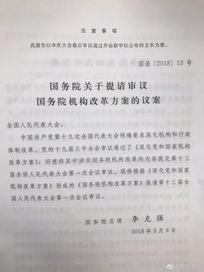 根據(jù)國務(wù)院總理李克強(qiáng)提請第十三屆全國人民代表大會(huì)第一次會(huì)議審議的國務(wù)院機(jī)構(gòu)改革方案的議案: