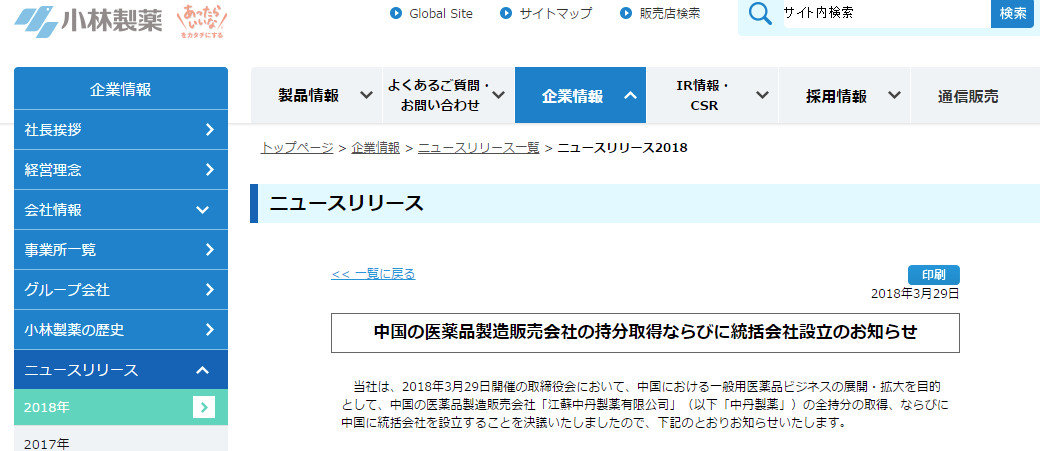 3月29日,小林制藥董事會(huì)在審議通過并購中丹制藥的同時(shí),也審議通過了在中國設(shè)立制藥總公司的決議。