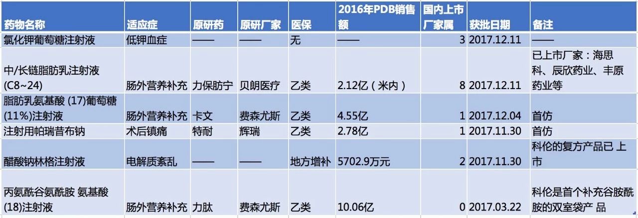 而在過(guò)去的2017年,科倫藥業(yè)也共計(jì)有7個(gè)仿制藥產(chǎn)品獲批上市。值得注意的是,其中有三個(gè)產(chǎn)品為首仿,分別為脂肪乳氨基酸(17)葡萄糖(11%)注射液、注射用帕瑞昔布鈉以及丙氨酰谷氨酰胺氨基酸(18)注射液,2016年其原研產(chǎn)品樣本醫(yī)院銷(xiāo)售數(shù)據(jù)分別為4.55億、2.78億、10.06億。
