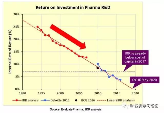 在這篇博客的第一部分,我介紹了一種簡單可靠的方法去計算制藥企業(yè)研發(fā)方面的內(nèi)部收益率(IRR),僅僅以業(yè)內(nèi)真實的歷史損益表現(xiàn)為基礎。隨后,我展示了這20年來,制藥企業(yè)的內(nèi)部收益率一直在快速而穩(wěn)定地線性下滑,這與最近BCG和德勤最近的測算一致,此現(xiàn)象可以被邊際效益遞減規(guī)律所解釋,而這又是對有限的投資機會排優(yōu)先級而造成的自然而然、卻又不可避免的結(jié)果,而且,每一個新藥都為其后繼者設定了一個更高的門檻。最后,我展示了對這一穩(wěn)定的線性趨勢做簡單外推的結(jié)果:到2020年,制藥企業(yè)的內(nèi)部收益率將降到0%,這意味著,現(xiàn)在行業(yè)已經(jīng)瀕臨致命的衰退,因為它將進入銷售負增長、研發(fā)投資負增長的死循環(huán)。