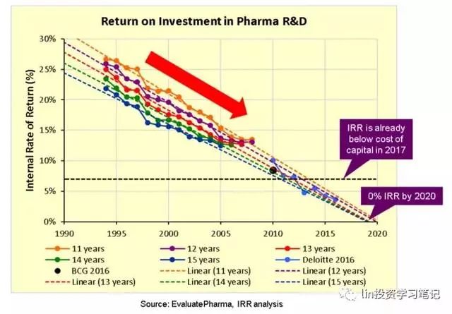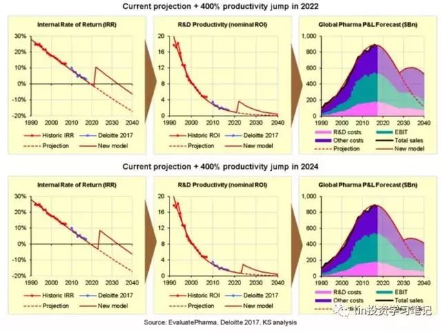 請注意,這里的內(nèi)部收益率曲線也是保持完美的線性下降趨勢,直接穿越了0%的內(nèi)部收益率,這正是我們上面對制藥研發(fā)效率的分析所看到的! 這個影響是相當驚人的: